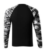strih s bočnými švami, úzky lem priekrčníka z rebrového úpletu 1:1 s 5 % elastanu, vnútorná časť priekrčníka začistená páskou vo farbe 01, dlhé raglánové rukávy vo farbe camouflage