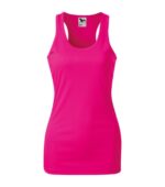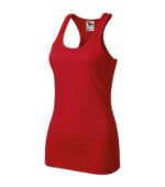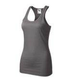 hladký rýchloschnúci materiál, zľahka vypasovaný strih s bočnými švami, vykrojený zadný diel tielka (racerback), hrubší guľatý výstrih, priekrčník a prieramky lemované povrchovým materiálom, ideálne pre šport a pohybové aktivity, materiál vhodný pre sublimačnú potlač (svetlé farby)