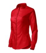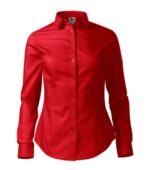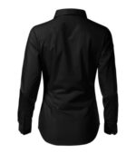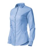 zúžený strih s bočními švami, pásové a prsné záševky, dvojdielny košeľový golier, predné kraje začistené légou, dlhé rukávy so šikmou manžetou na 2 gombíčky, gombíčky vo farbe materiálu (2 náhradné naviac), tvarovaný dolný okraj