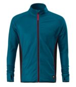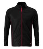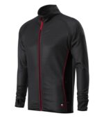 hladký strečový rýchloschnúci materiál, rovný strih s bočnými švami, celozapínací reverzný špirálový zips s krytkou brady, vnútorný priekrčník začistený páskou, raglánové rukávy, manžety s otvorom pre palec, vrecká na zips, lemovanie elastickým pásikom, kontrastné prvky, pútko na zavesenie